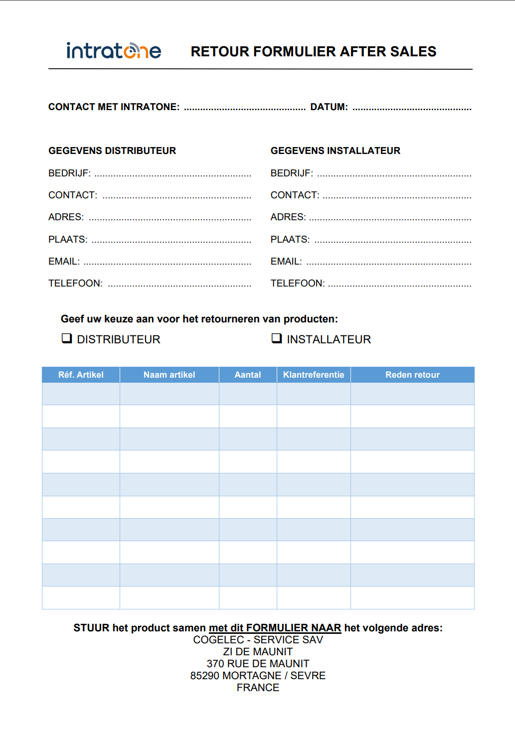 Mocht er iets mis zijn met uw Intratone product, neem dan altijd eerst telefonisch contact met ons op. Wordt er in overleg een rechtmatig defect vastgesteld? Dan ontvangt u direct een aftersales-ticket en starten we het proces op.
